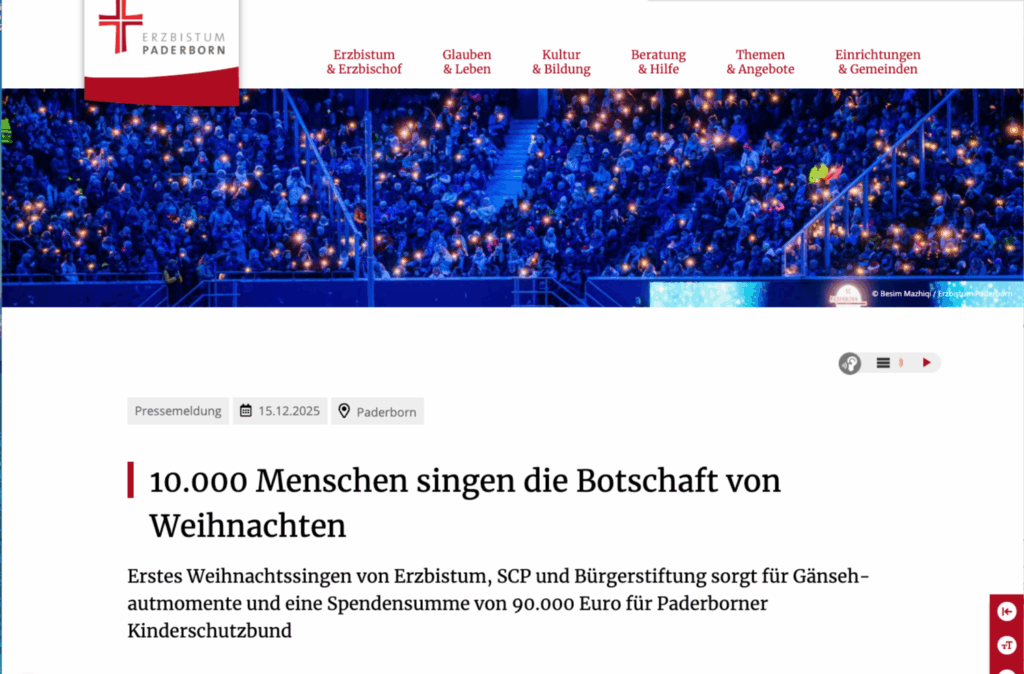 In Kooperation mit dem Erzbistum Paderborn und der Bürgerstiftung Paderborn hat der SC Paderborn zu dem weihnachtlichen Event in seine Arena eingeladen. Musikalisch wurde der Abend unter anderem von den Chören der Dommusik Paderborn mit Domchor, Mädchenkantorei und Domkantorei,