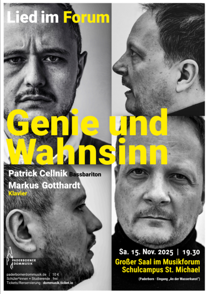 Genie und Wahnsinn In der nächsten Ausgabe von „Lied im Forum“ im Musikforum der Michaelschulen erwartet Sie ein außergewöhnlicher Liederabend in Form eines Konzeptalbums. Im Mittelpunkt stehen Robert Schumann, Friedrich Hölderlin und Nikolaus Lenau – große Künstler, deren Leben und…