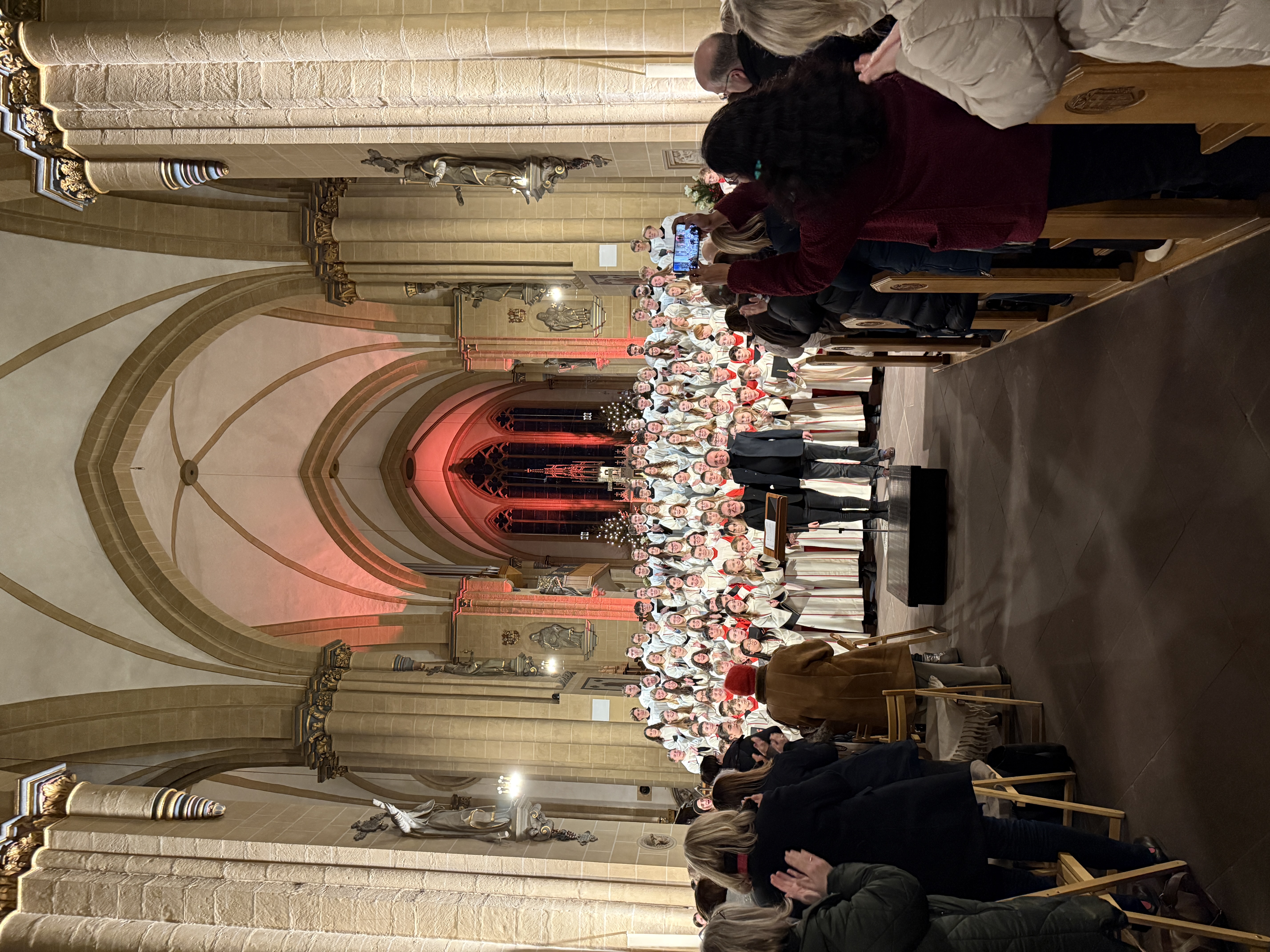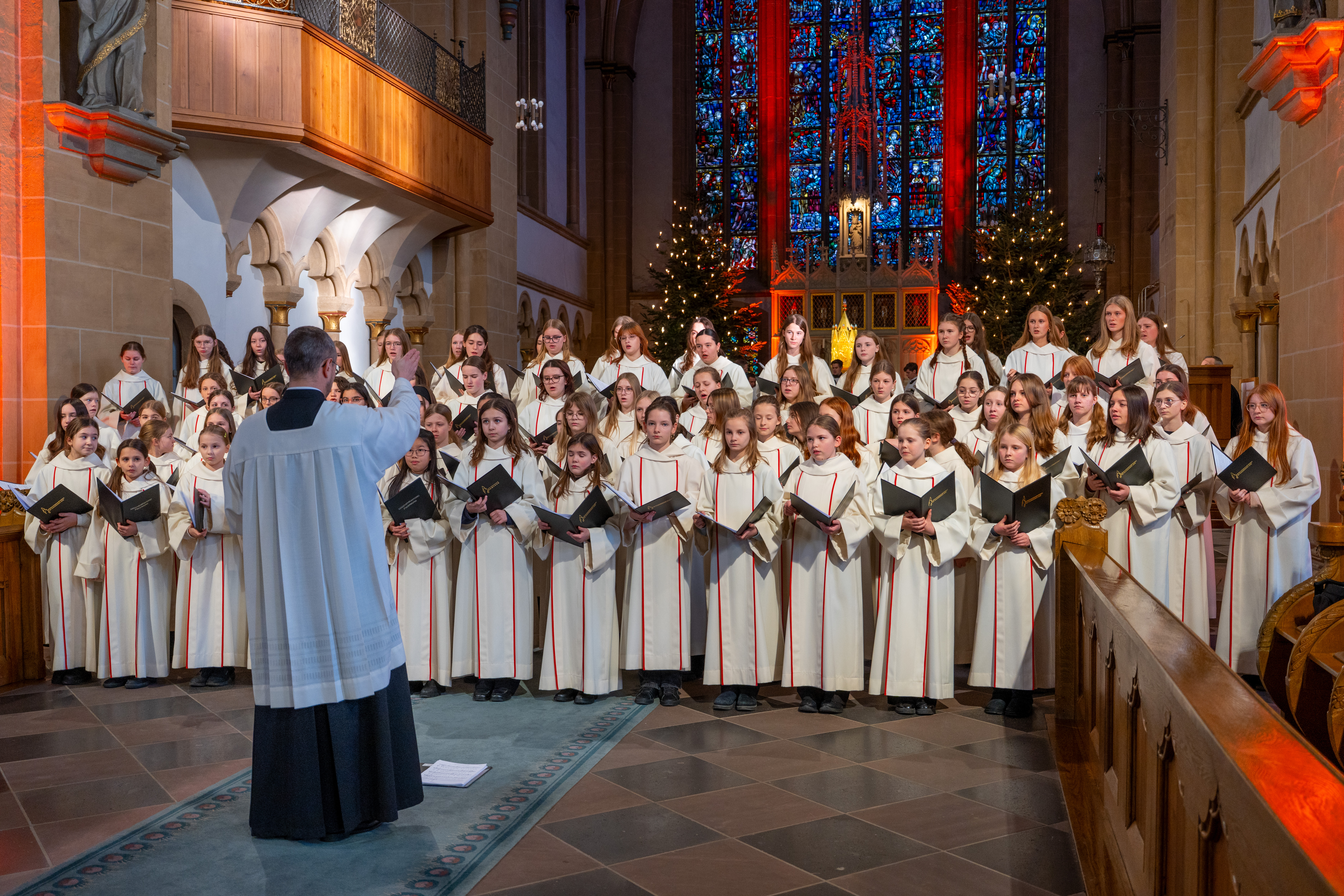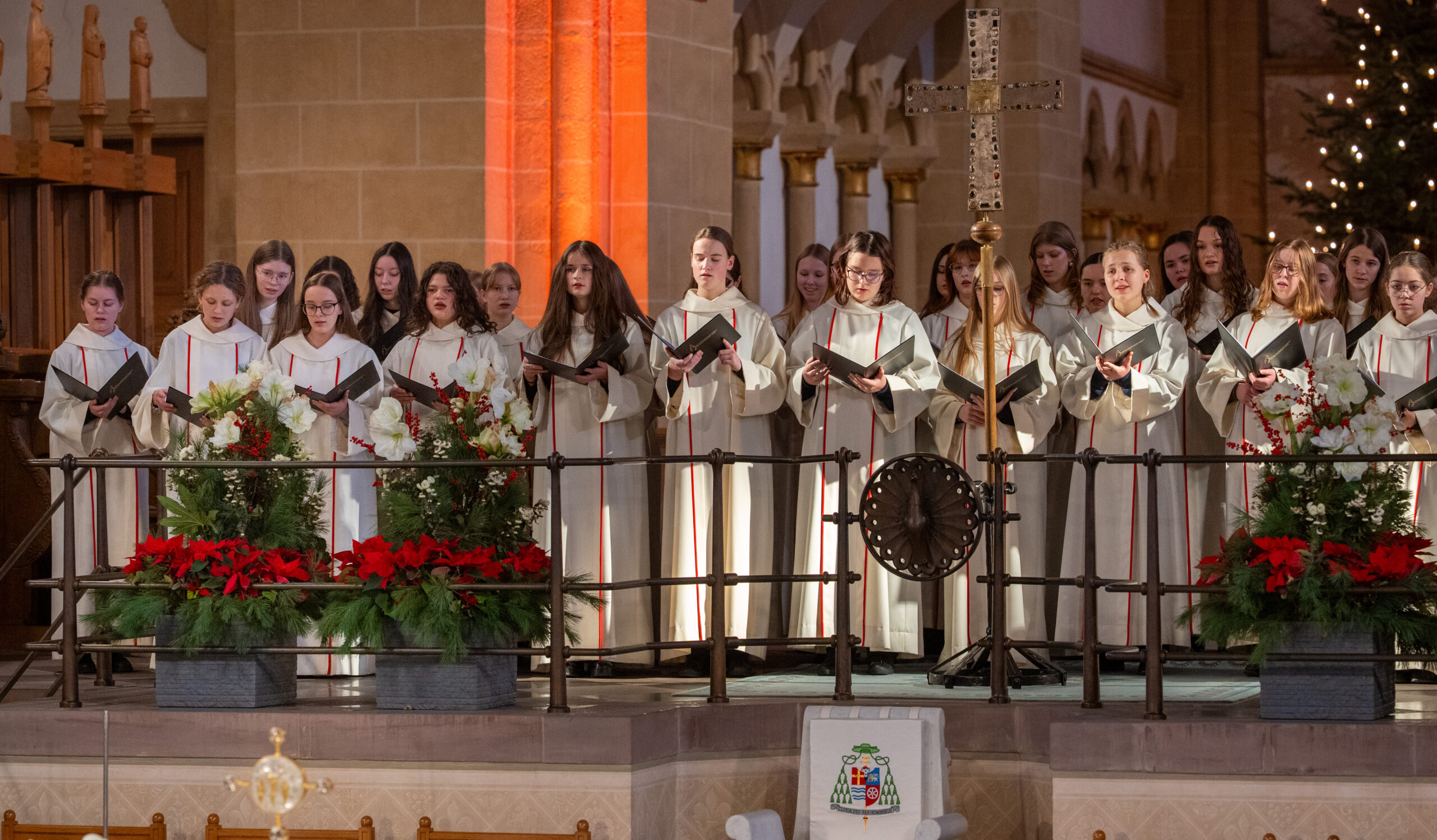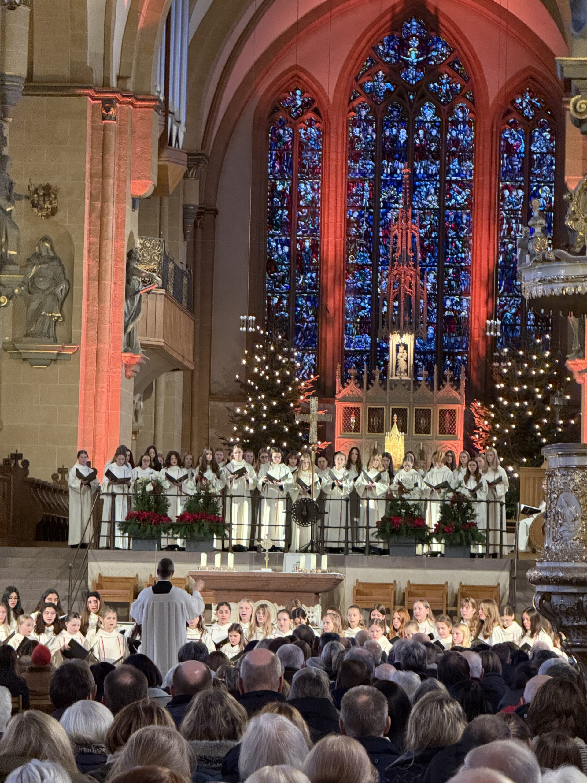 Im weiteren Verlauf entwickelte sich ein lebendiges Wechselspiel zwischen Domchor und Mädchenkantorei. Werke wie „Carol of the Bells“, „Adeste Fideles“, „Die Engel und die Hirten“ sowie „Es ist ein Ros entsprungen“ erklangen aus verschiedenen Teilen des Domes und nutzten den Kirchenraum klanglich in eindrucksvoller Weise.