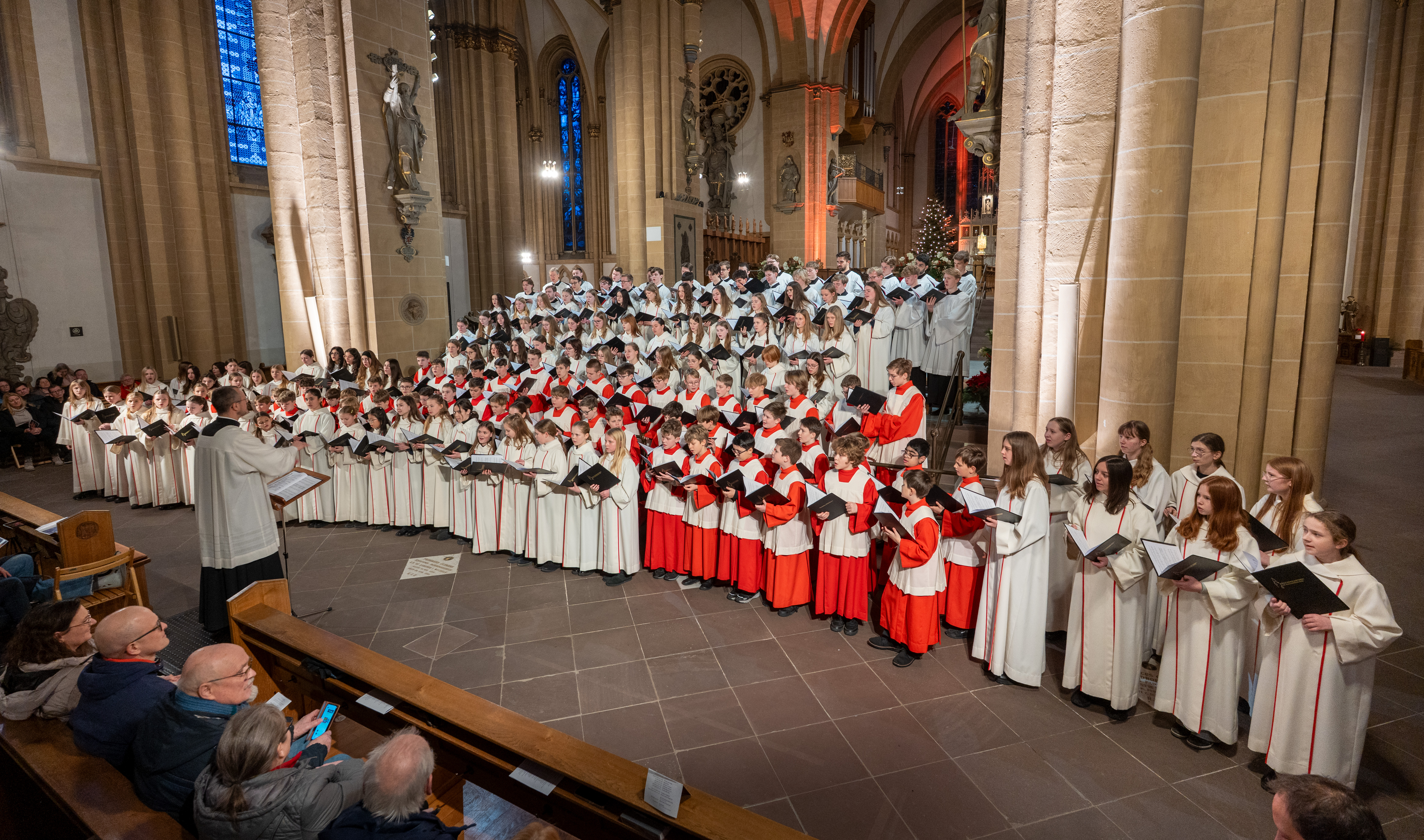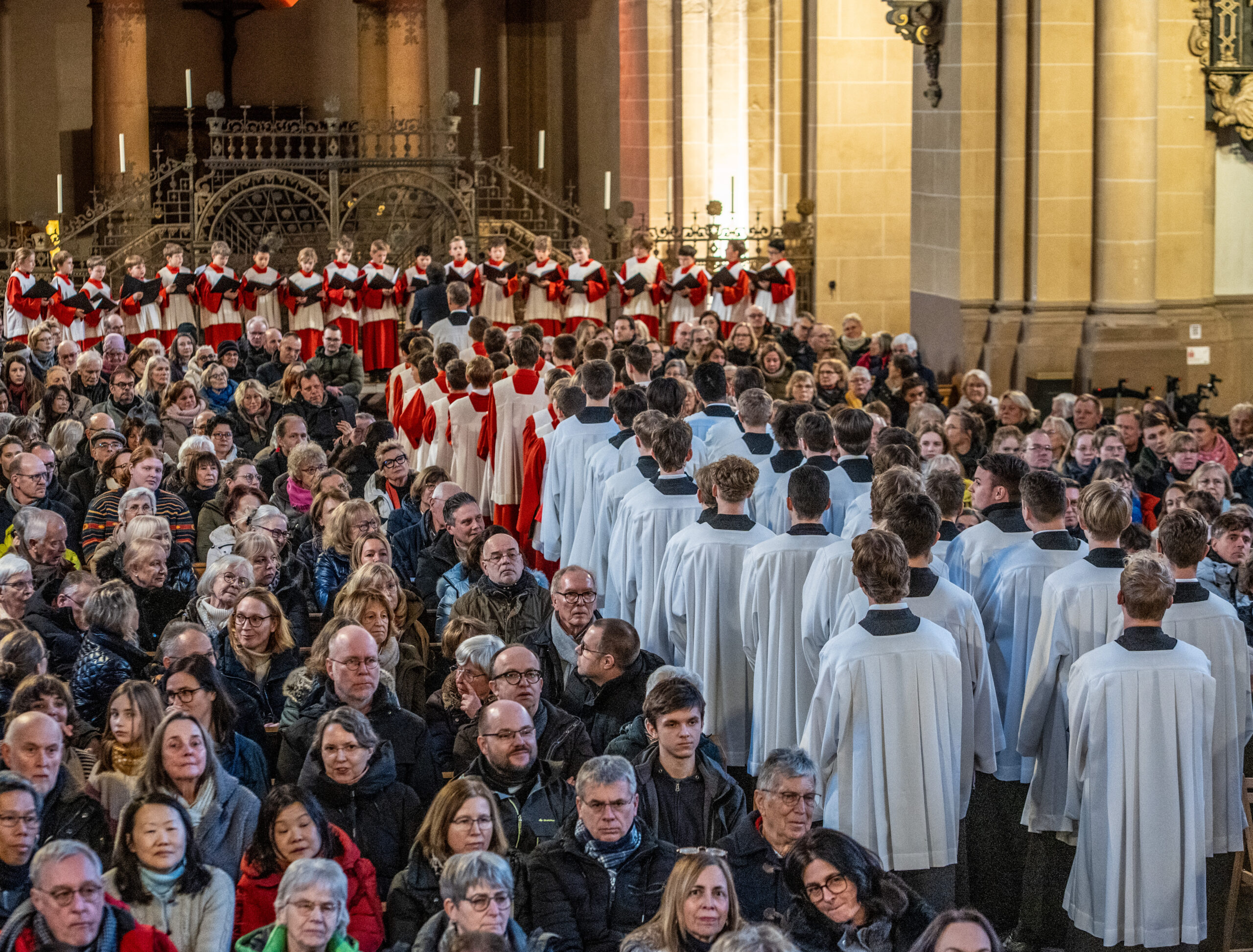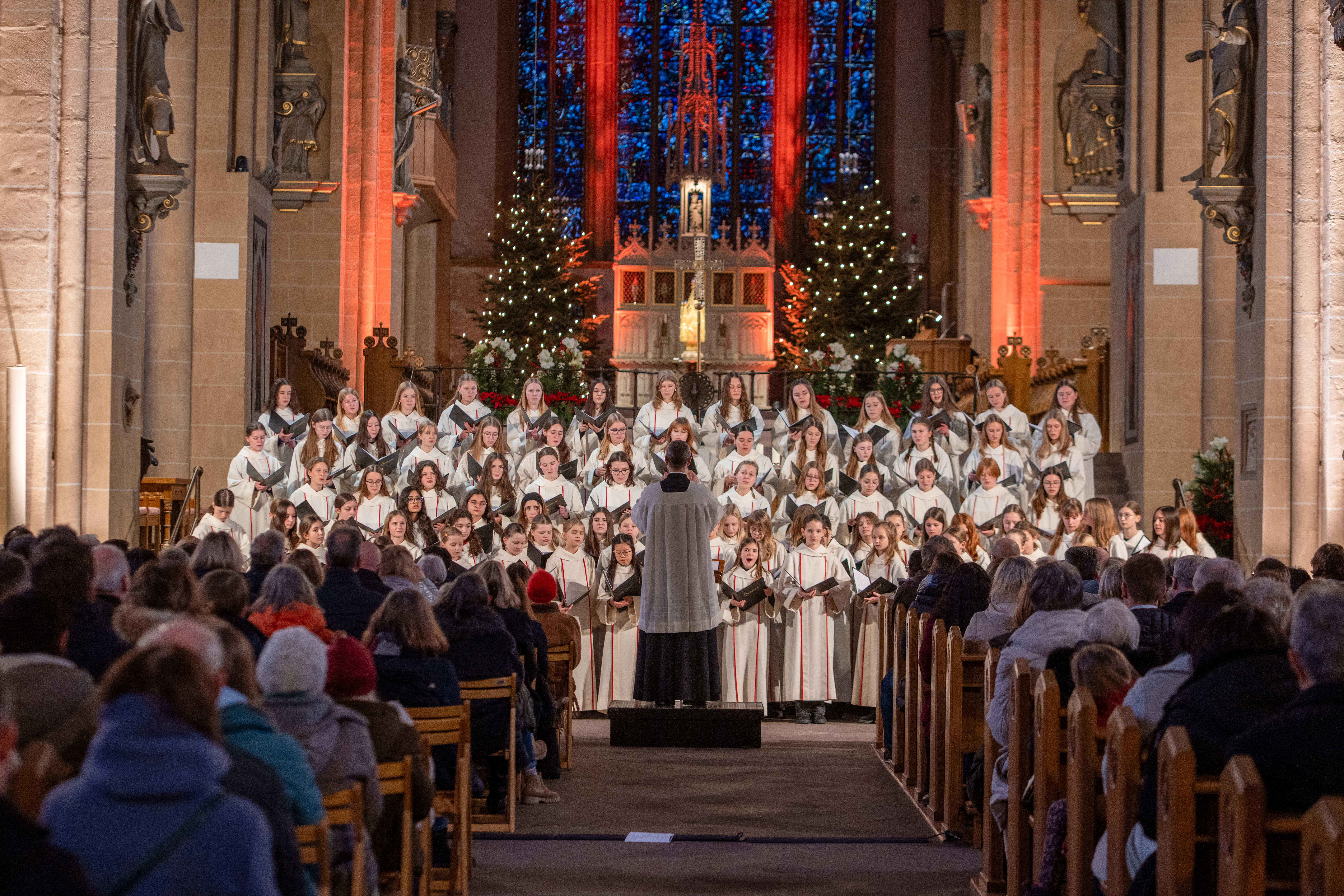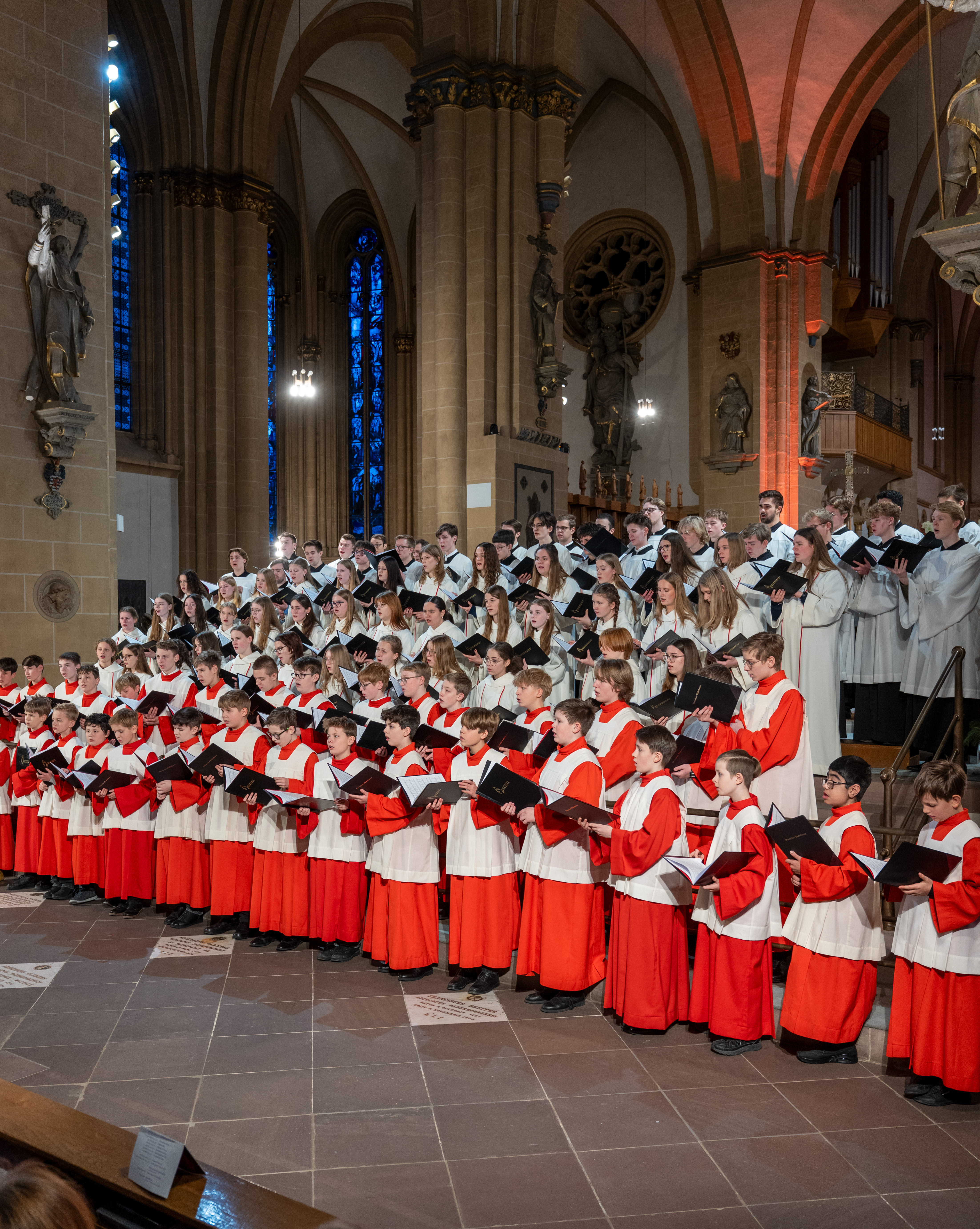 Das Konzert begann mit den Männerstimmen des Domchores im Hochchor, die mit differenzierter Klanggestaltung überzeugten. Mit dem Hinzutreten solistischer Knabenstimmen entfaltete sich der Chor in voller Klangpracht. Einen spannenden räumlichen Kontrast setzte anschließend die Mädchenkantorei, die von den Altarstufen aus sang und mit großer Präzision, ausgewogenem Chorklang und hervorragender Textverständlichkeit begeisterte – in deutscher, lateinischer, englischer und französischer Sprache.