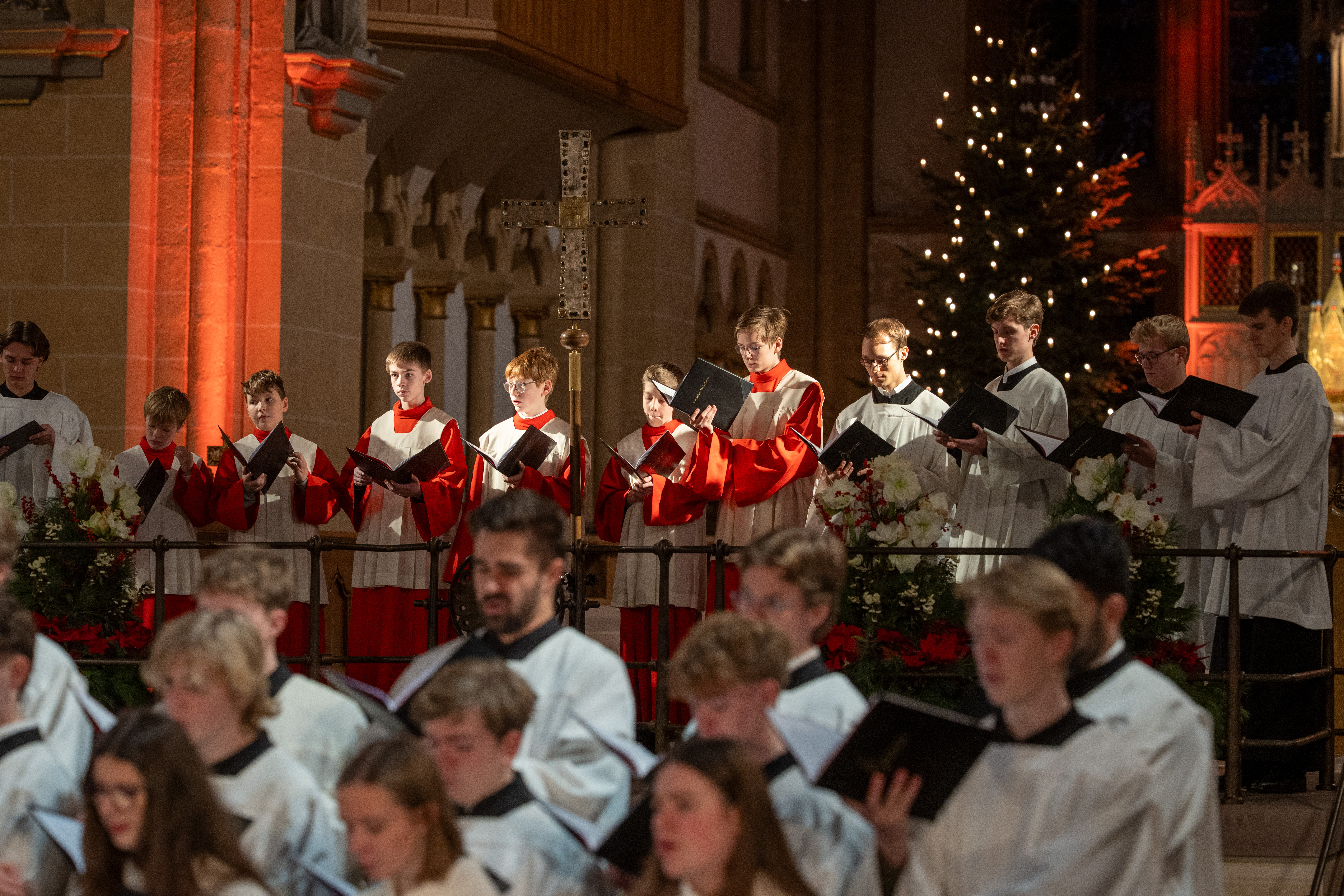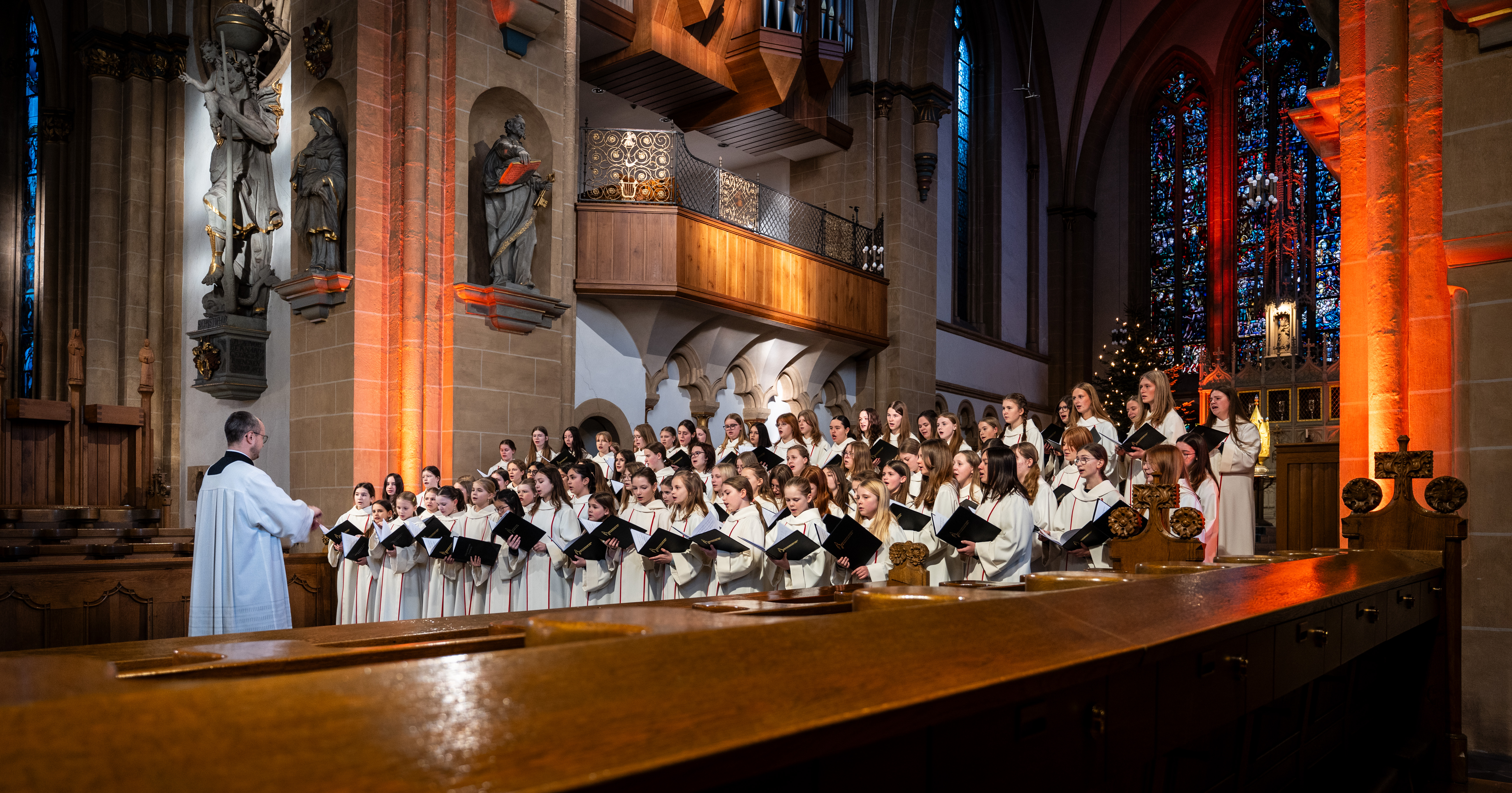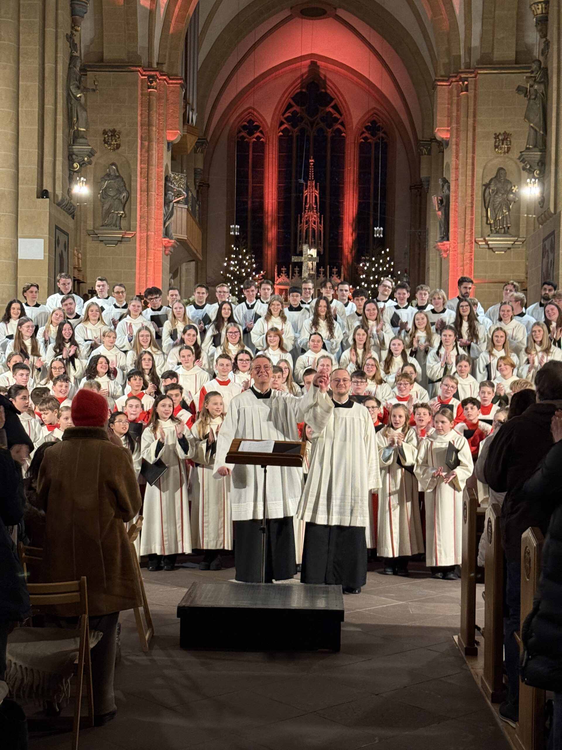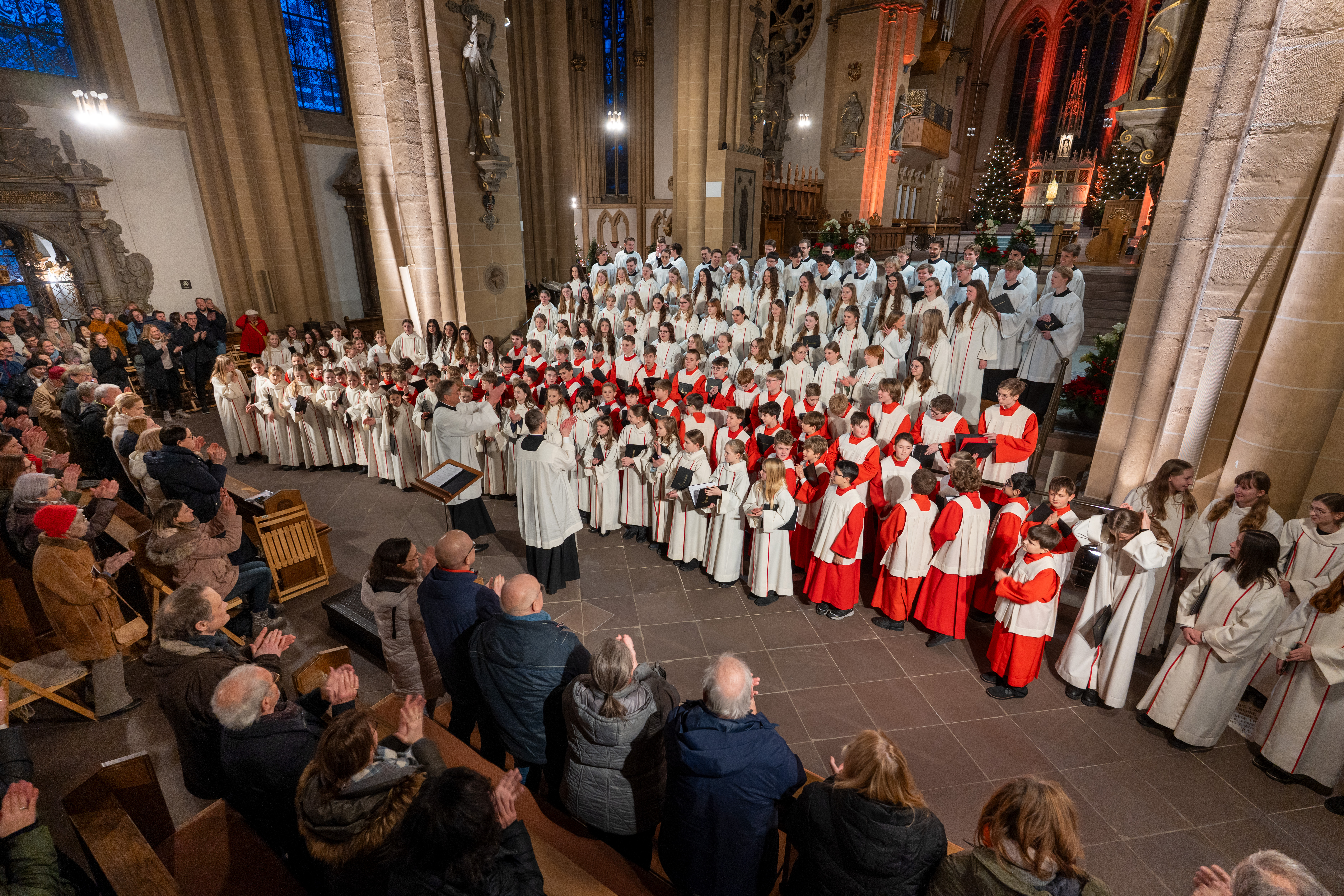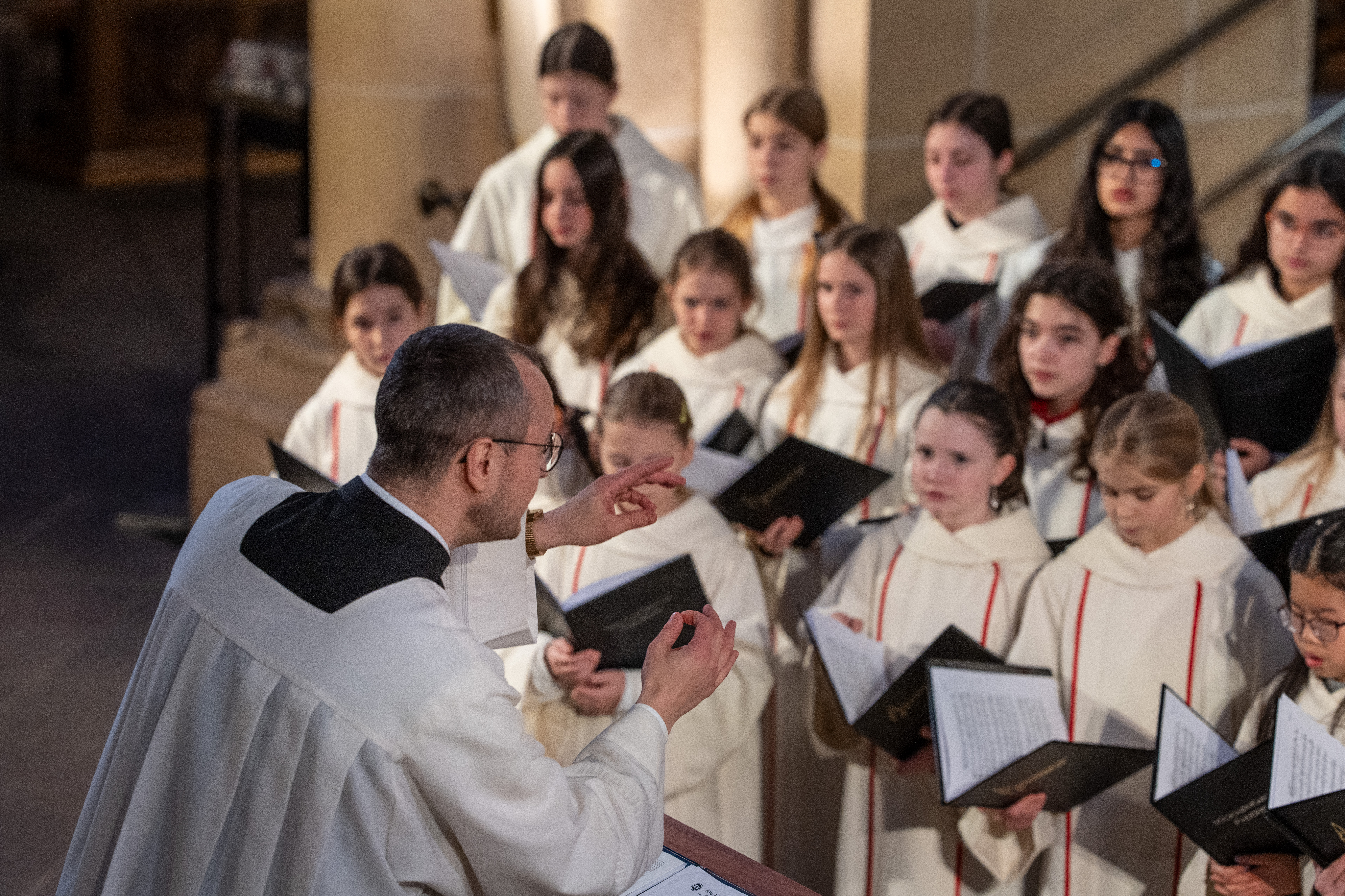Das Konzert begann mit den Männerstimmen des Domchores im Hochchor, die mit differenzierter Klanggestaltung überzeugten. Mit dem Hinzutreten solistischer Knabenstimmen entfaltete sich der Chor in voller Klangpracht. Einen spannenden räumlichen Kontrast setzte anschließend die Mädchenkantorei, die von den Altarstufen aus sang und mit großer Präzision, ausgewogenem Chorklang und hervorragender Textverständlichkeit begeisterte – in deutscher, lateinischer, englischer und französischer Sprache.